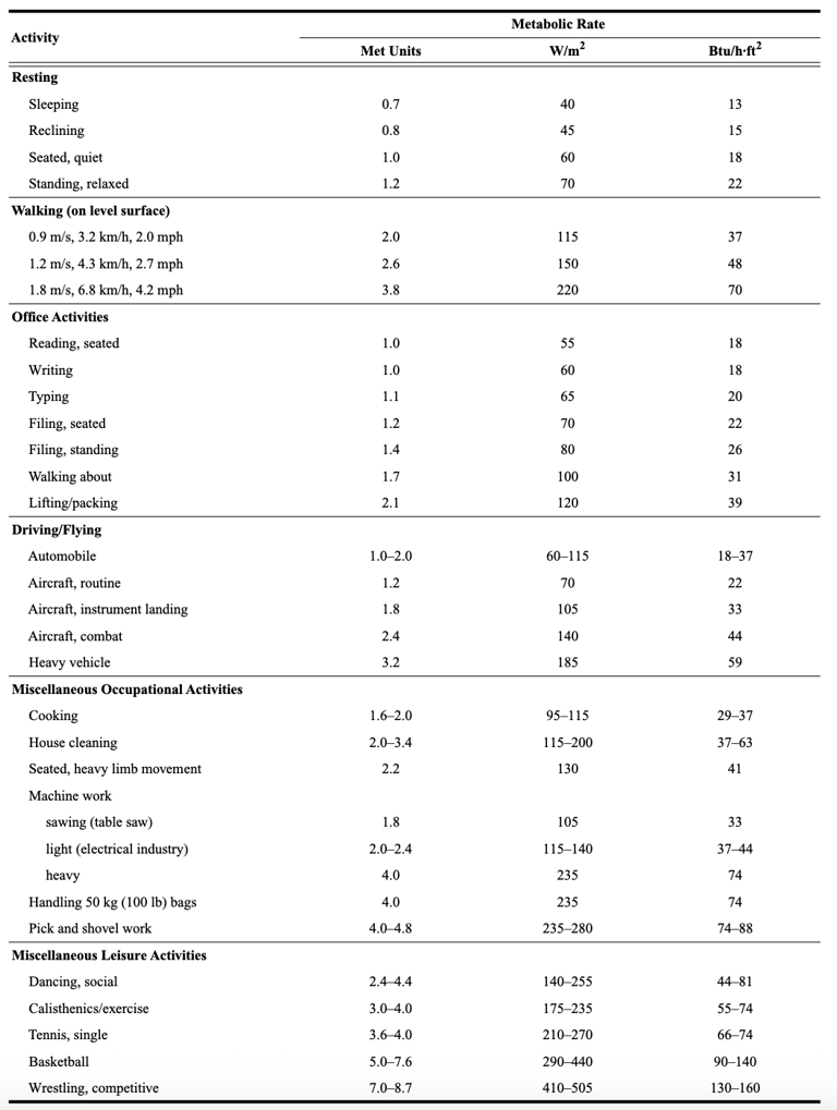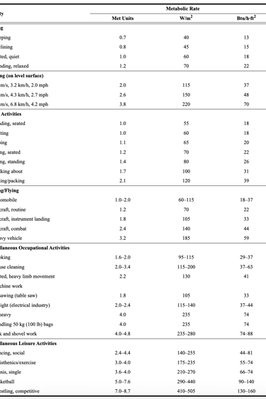 The concept of Metabolic Equivalent of Task (MET) serves as an important metric in assessing energy expenditure during various physical activities. MET values quantify the amount of energy expended while performing specific tasks, facilitating a better understanding of how energy levels correspond with indoor comfort conditions. Activities range from sedentary to vigorous, and each carries a different MET value, reflecting the intensity of energy expenditure.