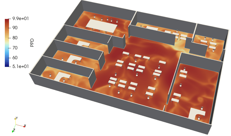 3. Draught Rate (DR): The Draught Rate measures the likelihood that people will experience unpleasant drafts in a space. This parameter is critical for ensuring airflow design does not lead to discomfort. Learn More >>