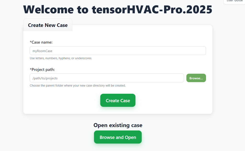 In tensorHVAC-Pro 2025, every simulation is organized into a project folder that contains all the necessary files for setup, meshing, and running your HVAC case. When you first open the software, you will see two main options: Create New Case and Open Existing Case. These options help you either start a new simulation or continue working on an existing one.