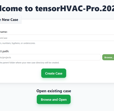 If you already have an existing project that you want to continue working on, use the Open existing case option. Click Browse and Open, navigate to your previous project folder, and select it. tensorHVAC-Pro will load all the associated data, allowing you to review, modify, or rerun the simulation as needed.