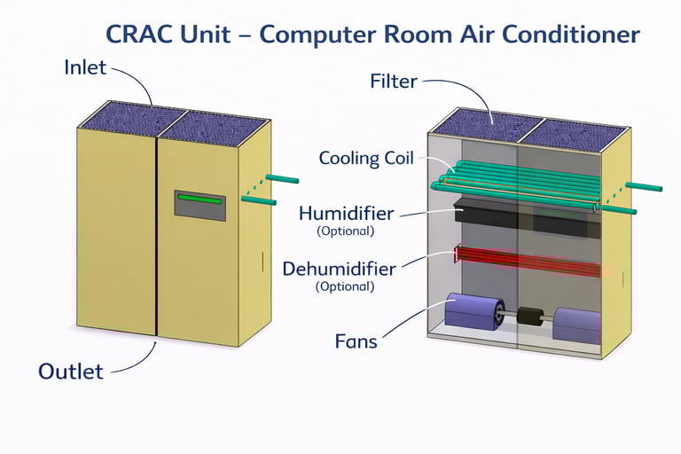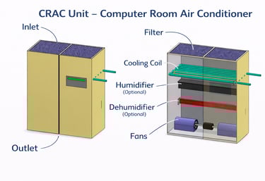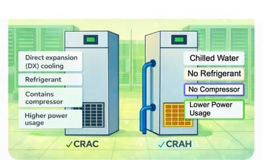 CRAH (Computer Room Air Handler) units use chilled water supplied from a central chiller plant. They consist mainly of fans and cooling coils. CRAH systems are typically more energy-efficient and suitable for large-scale data centers where centralized cooling infrastructure is available.