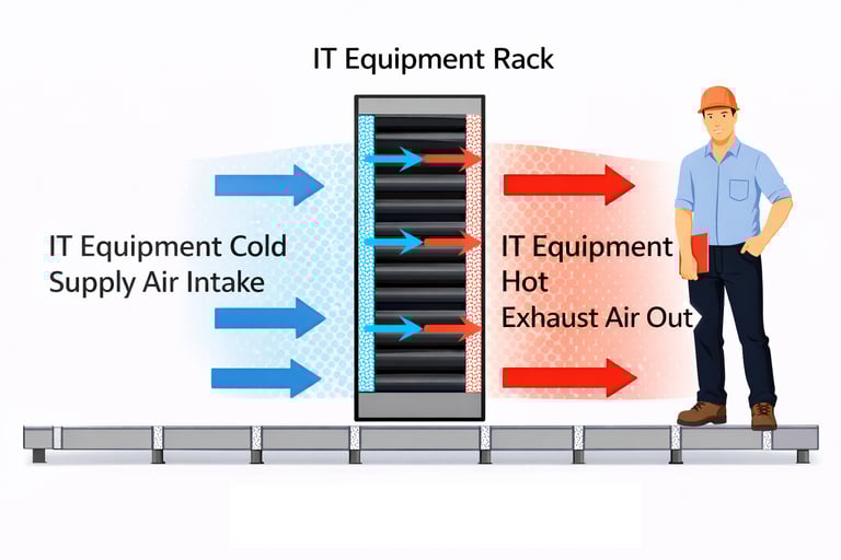 The layout of a data center strongly influences cooling performance. Servers are typically arranged in rows of racks that form hot aisles and cold aisles. Cold aisles face the front of server racks where cool air is supplied, while hot aisles face the rear where warm exhaust air exits.
