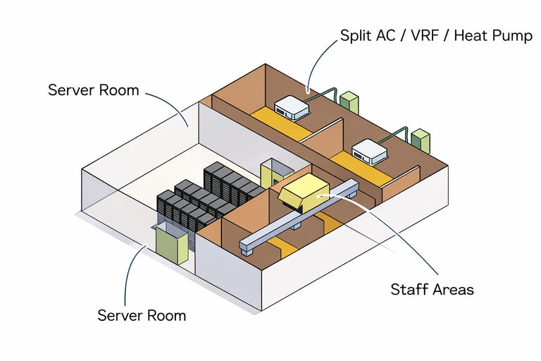 Cooling energy can account for 30–40% of a data center’s total energy consumption. Servers generate high heat loads due to dense electronic components, and strict temperature and humidity limits must be maintained for reliable operation. Therefore, efficient HVAC design is essential not only for thermal safety but also for reducing operational cost and environmental impact.