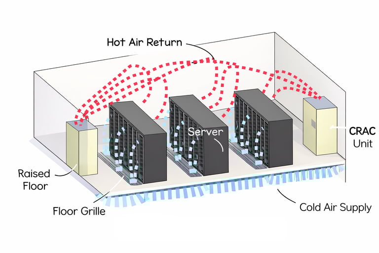 The raised floor approach provides flexibility for air distribution and cable management, but it also introduces challenges. Poorly designed plenums can lead to uneven airflow, pressure losses, and air recirculation. As rack power density increases, raised floor systems often require additional containment or close-coupled cooling solutions to remain effective.