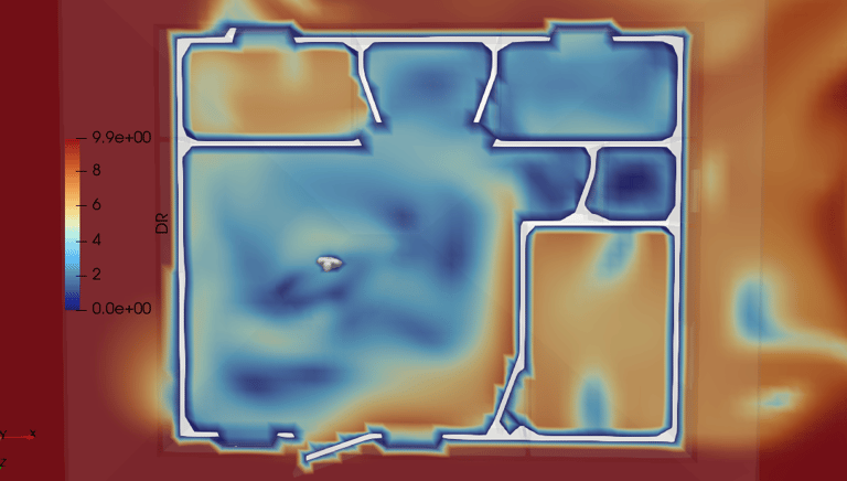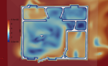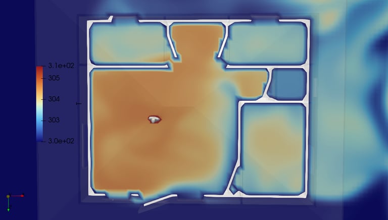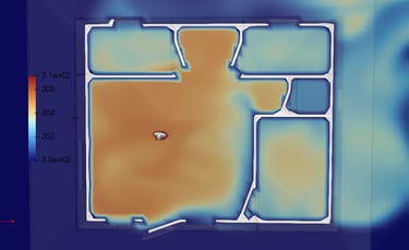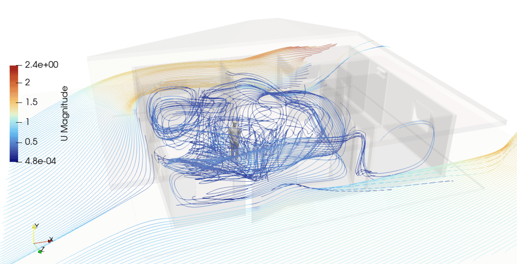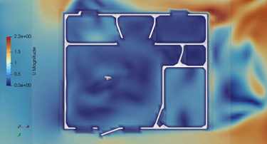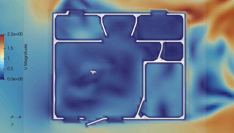 Velocity Field: Shows how external wind enters and circulates within the rooms, identifying dead zones and high-velocity regions.