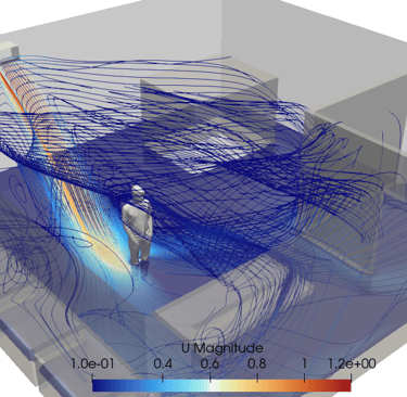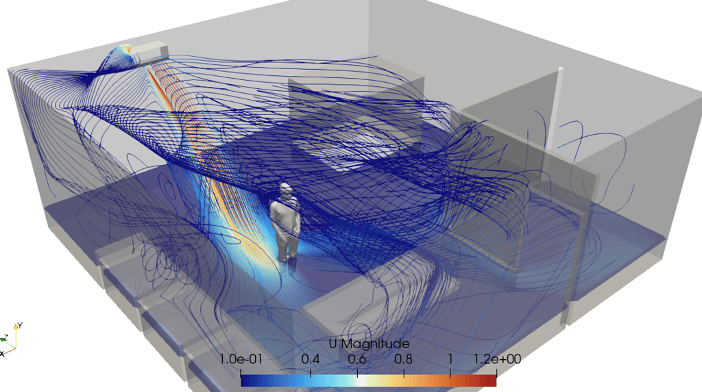 Computational Fluid Dynamics (CFD) allows designers to simulate 3D airflow inside a space, capturing both the magnitude and direction of air velocity vectors. The results are typically visualized as: