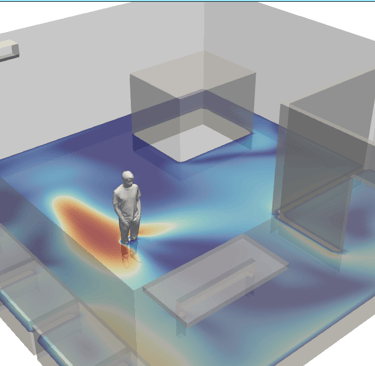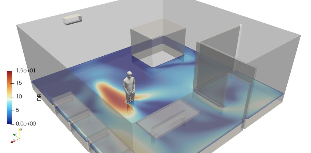 To quantify this effect, engineers use a comfort parameter known as the Draft Rate (DR). Analyzing the DR distribution across a building provides valuable insight into how air velocity, temperature, and turbulence interact to affect occupant comfort. With Computational Fluid Dynamics (CFD), designers can visualize DR fields and optimize diffuser placement, supply air velocity, and airflow patterns to minimize discomfort and enhance indoor air quality.