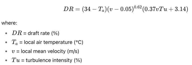 This formula, standardized in ISO 7730 and ASHRAE 55, captures how air speed, temperature, and fluctuating turbulence combine to create a cooling sensation that can make occupants uncomfortable.
