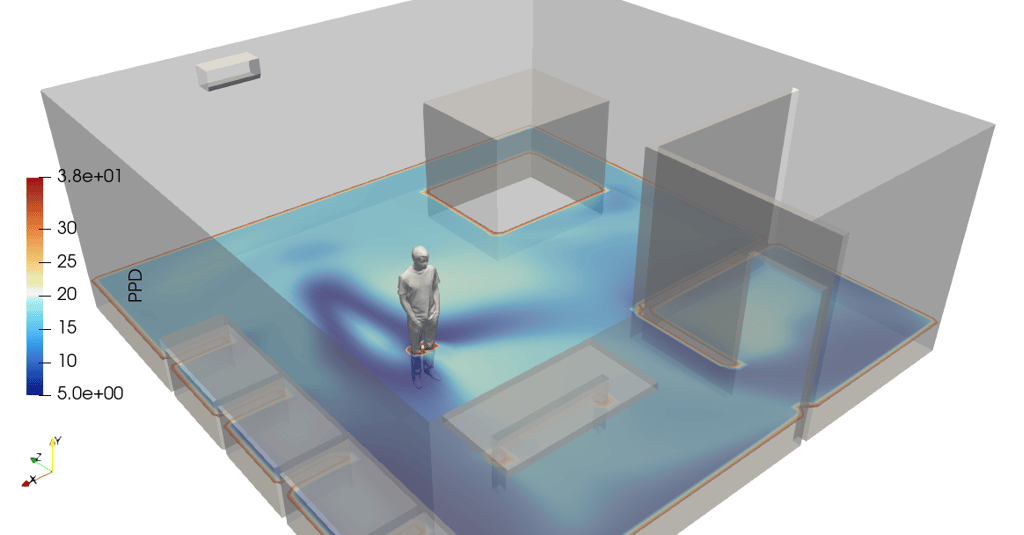 By analyzing PPD distribution across a building, engineers can evaluate how evenly comfort is achieved and identify areas where HVAC performance can be improved. Using Computational Fluid Dynamics (CFD), PPD can be calculated spatially, creating a clear map of comfort zones versus discomfort regions.