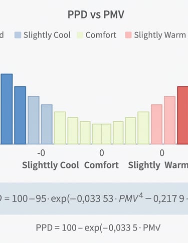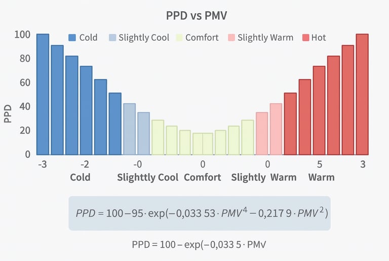 To quantify this variability, thermal comfort research introduces the Predicted Percentage of Dissatisfied (PPD) index — a statistical measure that predicts the percentage of people likely to feel thermally uncomfortable in a given space.