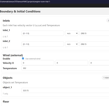 Boundary Conditions – Air inlet velocity, temperature, heat sources, and material properties are defined.