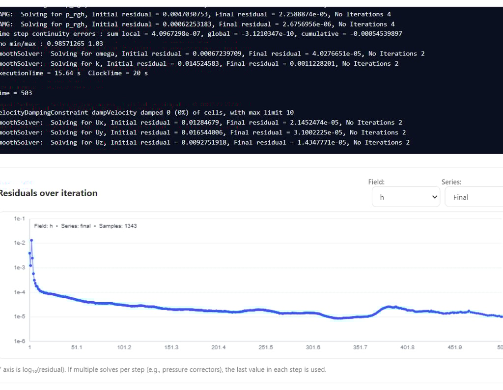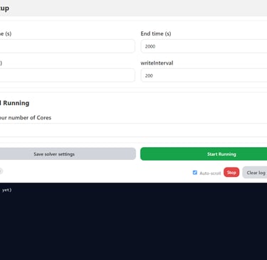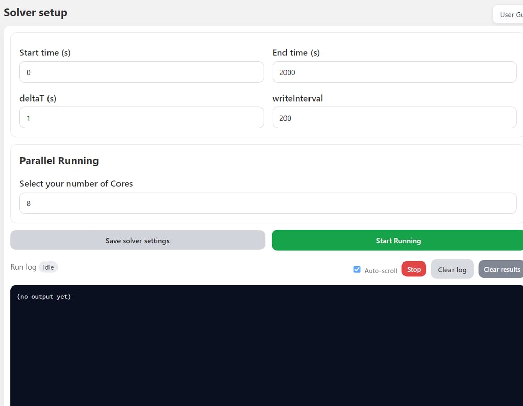 After entering all the solver parameters, click Save solver settings to store your configuration. When ready, press Start Running to begin the simulation. The progress and messages from the solver will appear in the Run log window below. This section shows live updates about the simulation’s progress, including time steps and convergence information. If you need to stop the simulation at any point, press the Stop button. The Clear log button removes previous messages from the display, while Clear results deletes existing output data so you can rerun the case with fresh settings.