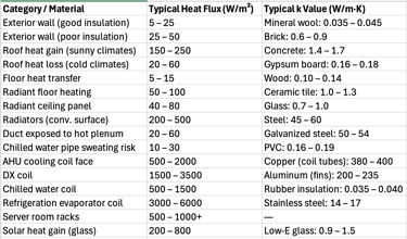 Typical values of heat flux and thermal conductivities in HVAC application to help define boundary condition definition of temperature in tensorHVAC-Pro