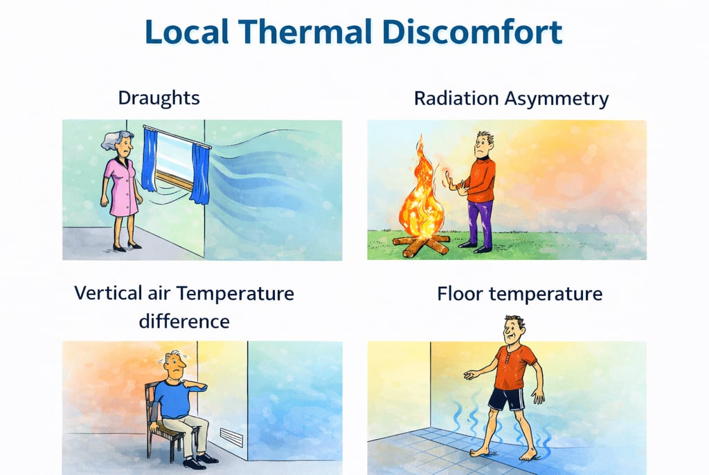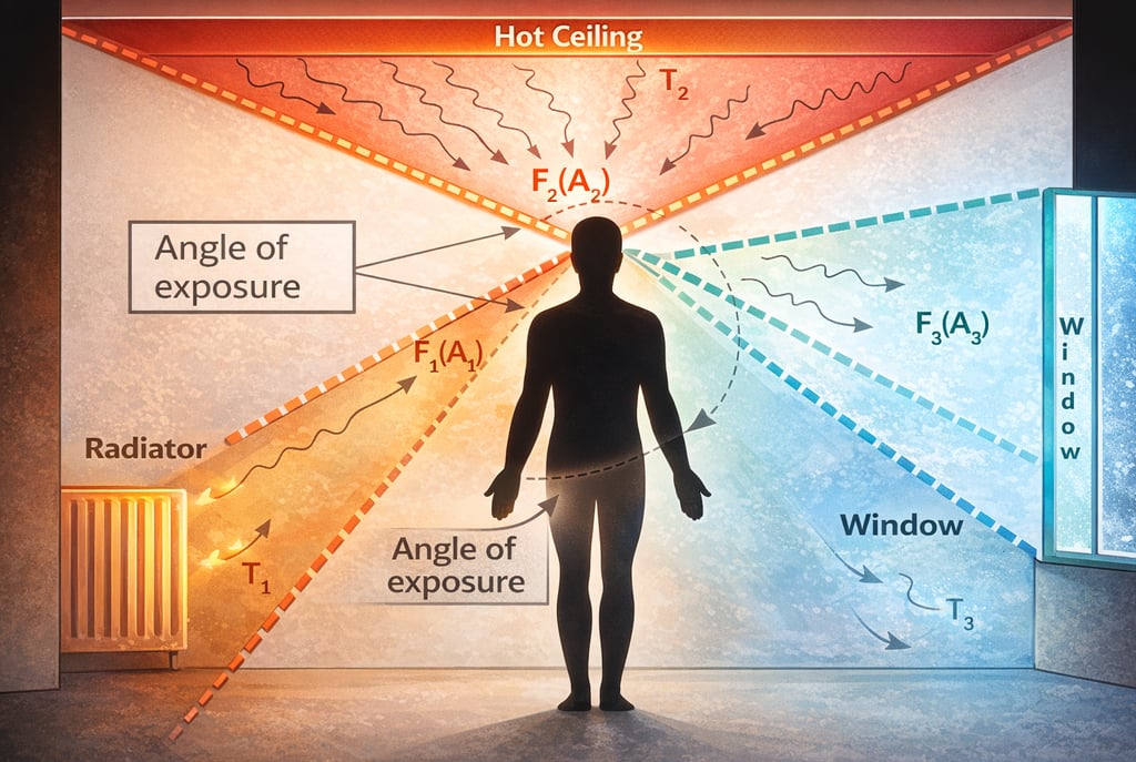 MRT becomes especially important when surface temperatures differ significantly from the air temperature. For example, sitting near a cold window in winter or a sunlit wall in summer can strongly affect comfort, even if the room’s air temperature remains unchanged. In such cases, the body gains or loses heat primarily through radiation rather than convection, leading to sensations of discomfort that cannot be explained by air temperature alone.