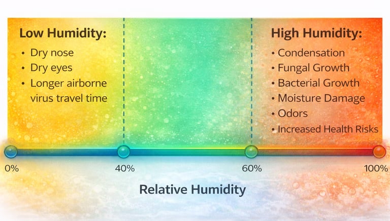 When relative humidity is too low, typically below about 30 %, moisture evaporates very quickly from the skin and mucous membranes. This can lead to dry skin, irritated eyes, sore throats, and discomfort in the respiratory system. Low humidity is common in air-conditioned spaces and in cold climates during winter, where heating systems significantly reduce indoor moisture levels.