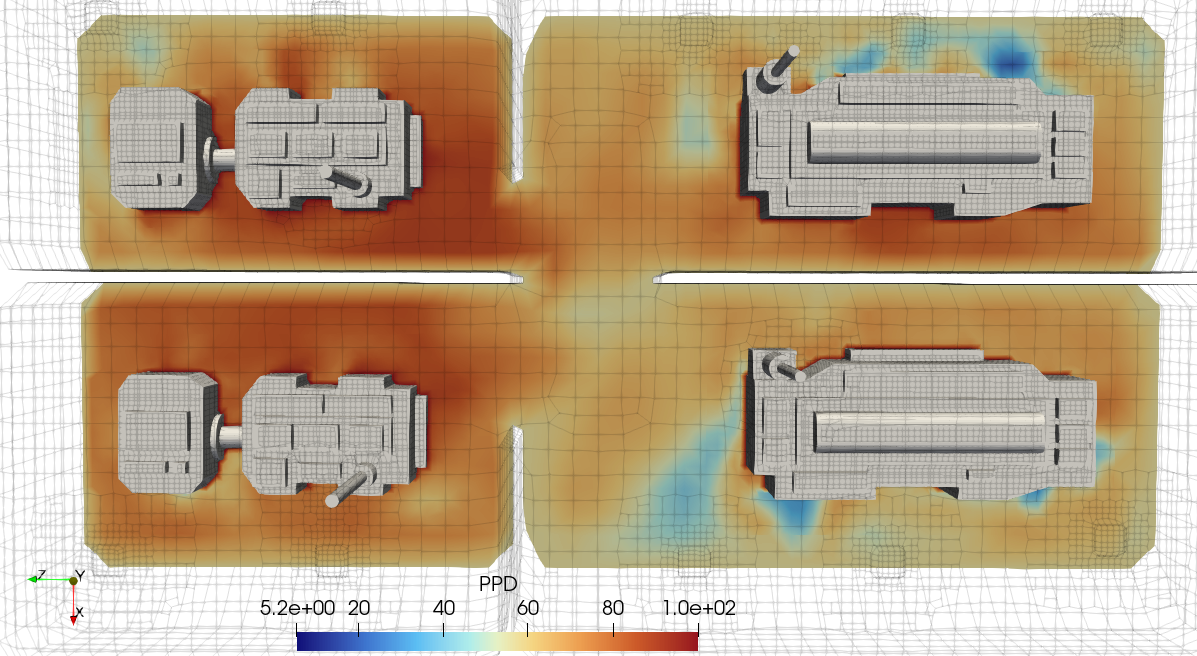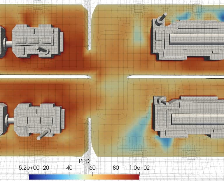 Beyond just visualizing airflow velocity and temperature distributions, tensorHVAC-Pro also provides insights into key thermal comfort parameters based on design industry best practices. These include indicators such as Predicted Mean Vote (PMV), Predicted Percentage of Dissatisfied (PPD), and local discomfort factors related to draft, vertical temperature differences, and radiant asymmetry. By integrating these comfort metrics directly into the flow and thermal HVAC CFD simulation software results, users can assess not only the system’s performance but also the actual comfort level experienced by occupants. This feature allows engineers and designers to make informed decisions to optimize HVAC designs for both energy efficiency and human comfort — all within a single, user-friendly environment.